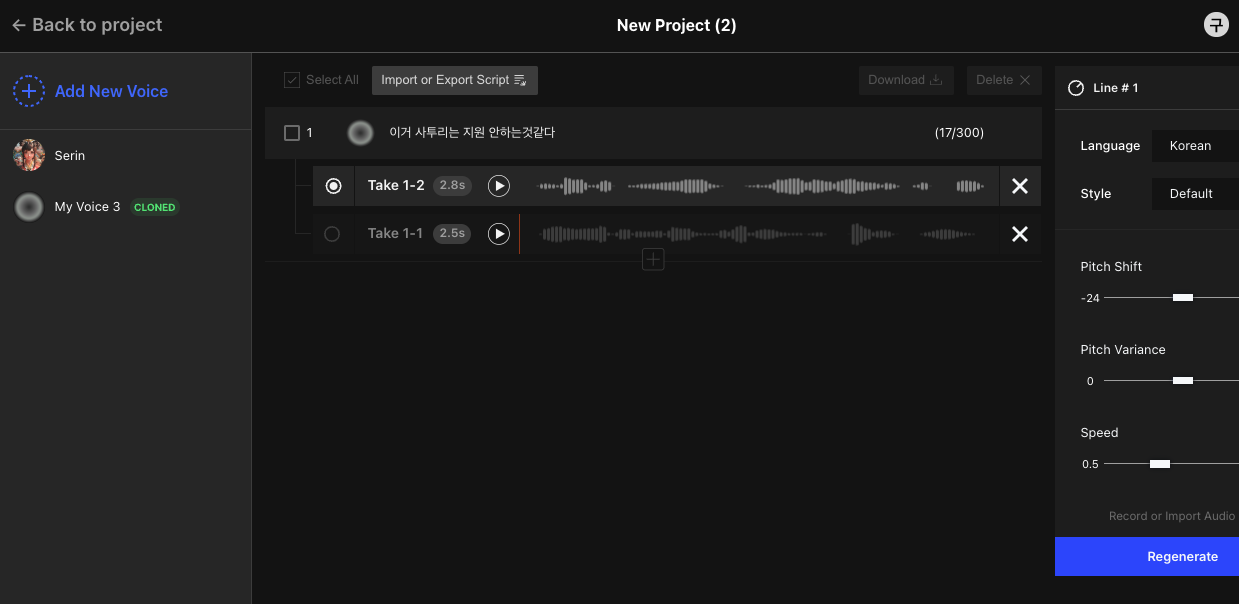 2) 음성 합성 - 학습된 모델을 이용해 입력된 텍스트를 대상 목소리로 합성한다.